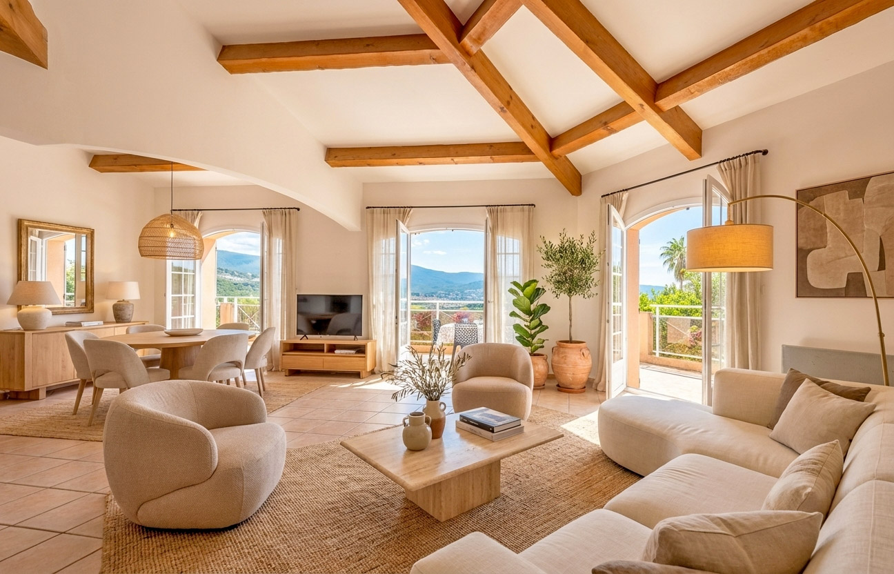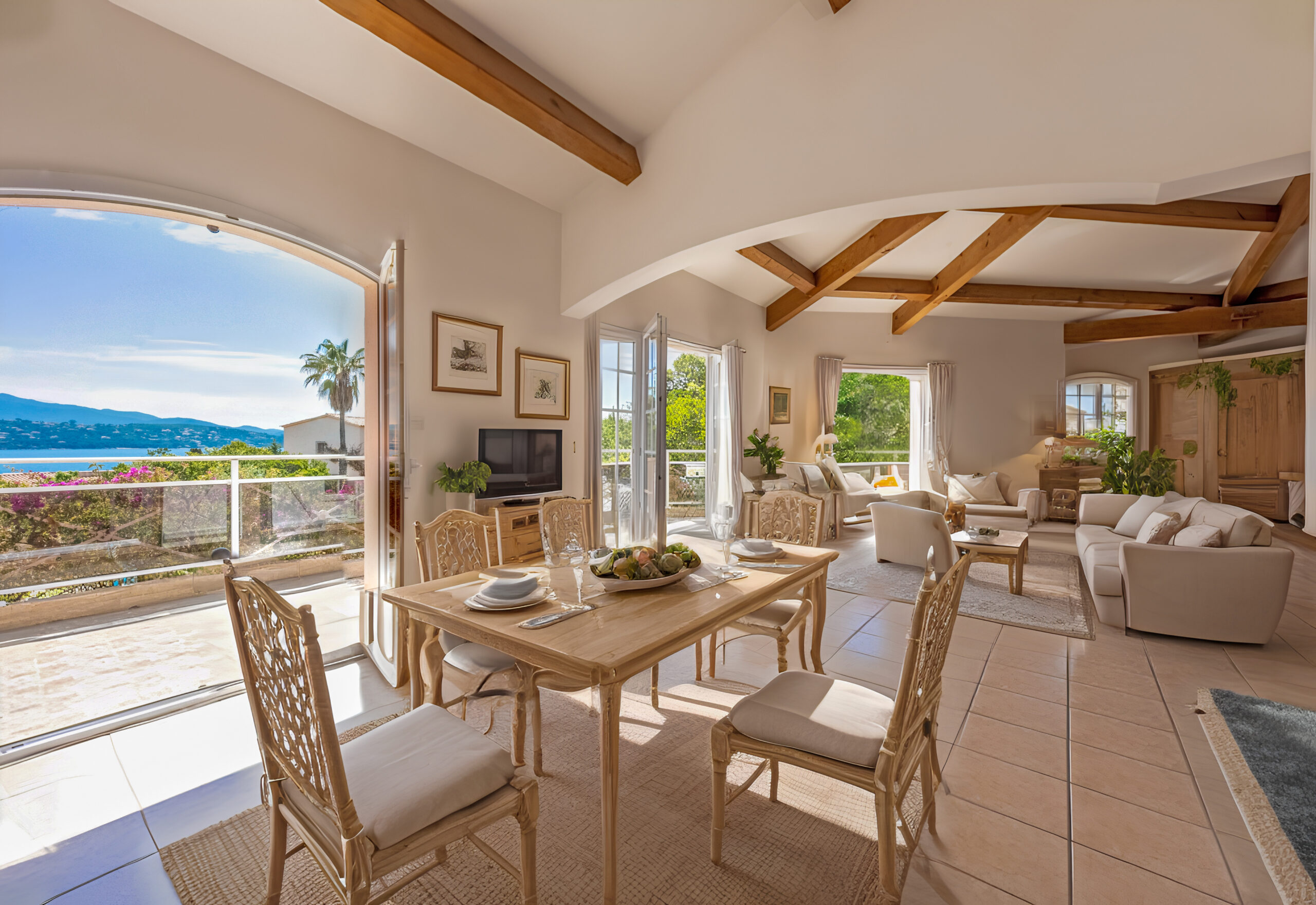 Développant environ 170 m² habitables, cette maison se compose d’un vaste séjour avec charpente apparente, cheminée et belle hauteur sous plafond, le tout prolongé d’une terrasse dominant la mer et la piscine.