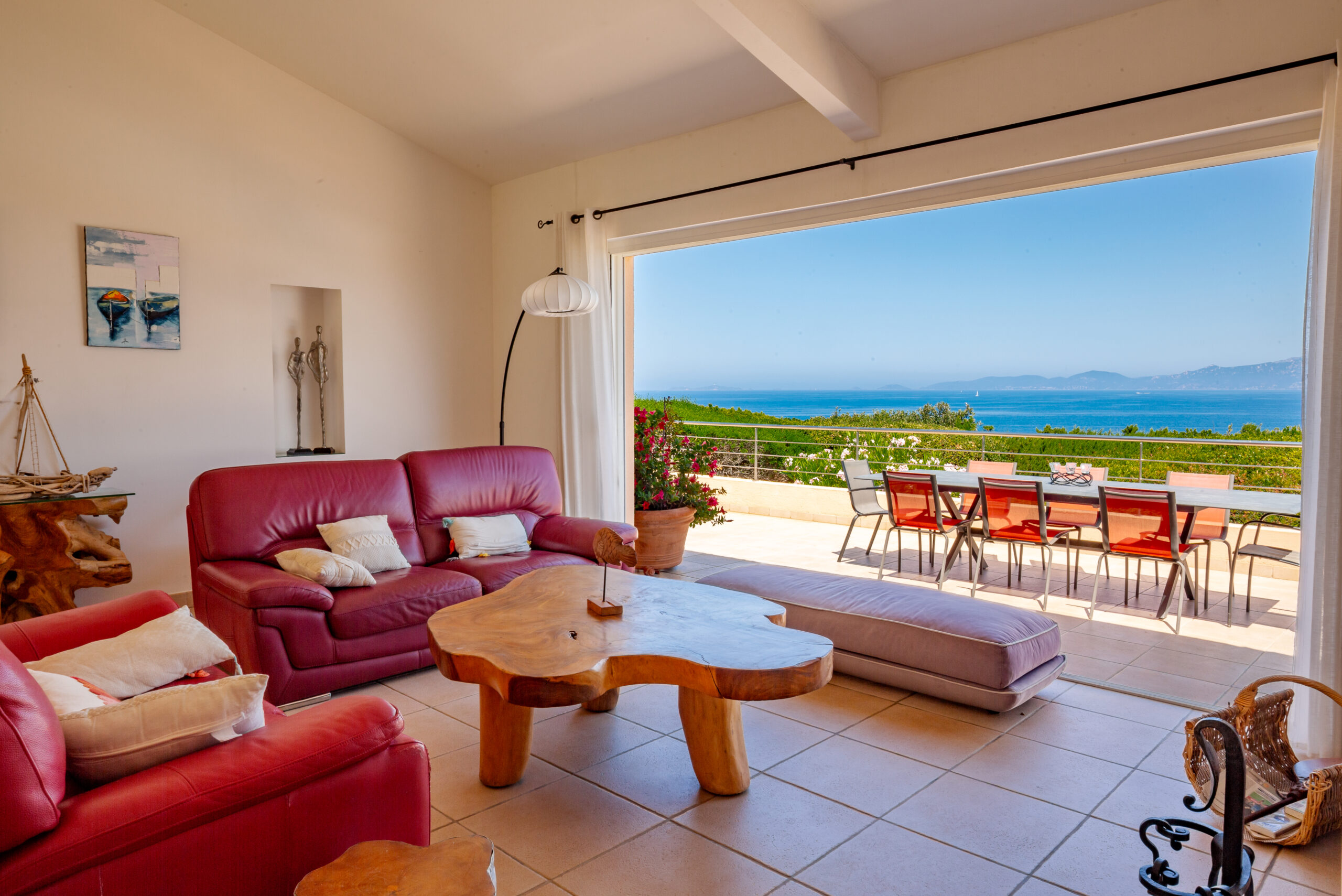 Le salon traversant s’ouvre sur la terrasse face à la mer.