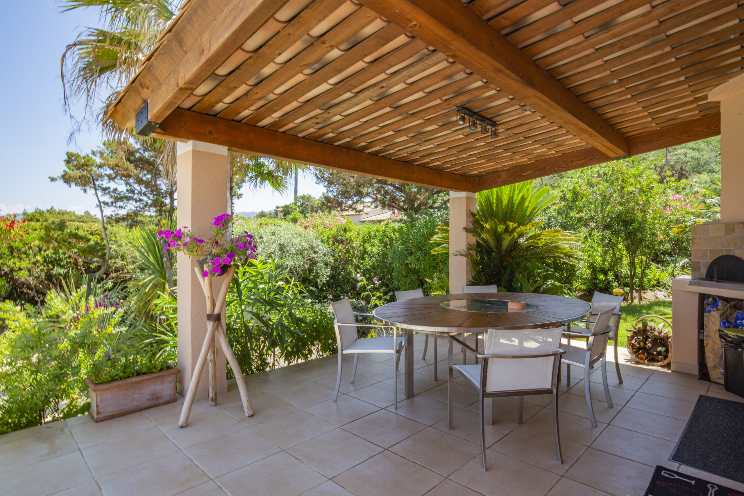 Ensuite, elle se prolonge par une salle à manger d’été couverte avec barbecue et four à pizza.