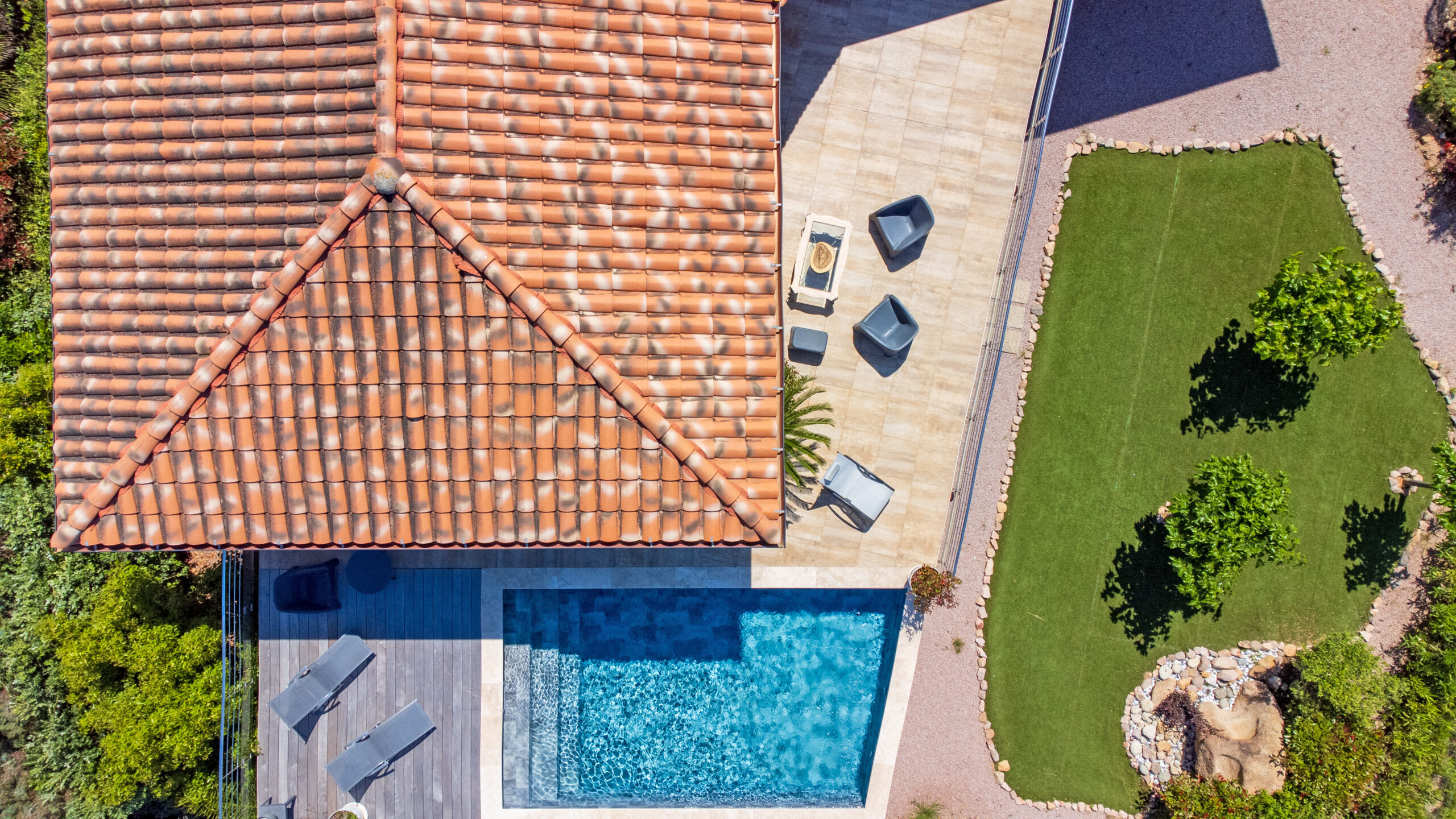 De larges baies vitrées s’ouvrent sur une terrasse ensoleillée, avec piscine, orientée vers la mer et le maquis. L’espace extérieur offre un vrai prolongement de vie, dans un cadre naturel apaisant.