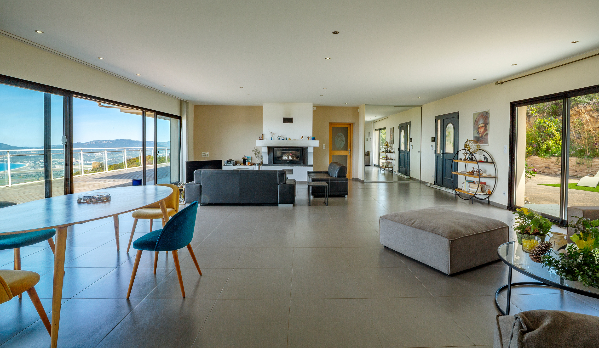 Puis, l’entrée mène à une pièce de vie traversante qui se prolonge vers une immense terrasse dominant le Golfe. Le séjour avec cheminée bénéficie d’une triple exposition, tandis qu’une véranda accompagne les moments conviviaux, du petit-déjeuner aux dîners face au bleu.